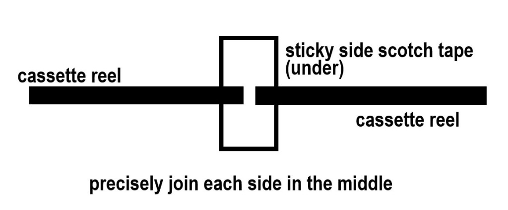 This type of cassette surgery is almost exactly like the one used by analog recording engineers when splicing and putting together analog 2 inch recording tape. The same concept applies when your cassette deck has week rollers, or the take up reel fails, feeding the tape into the rolling mechanism of the cassette, and damaging the tape.