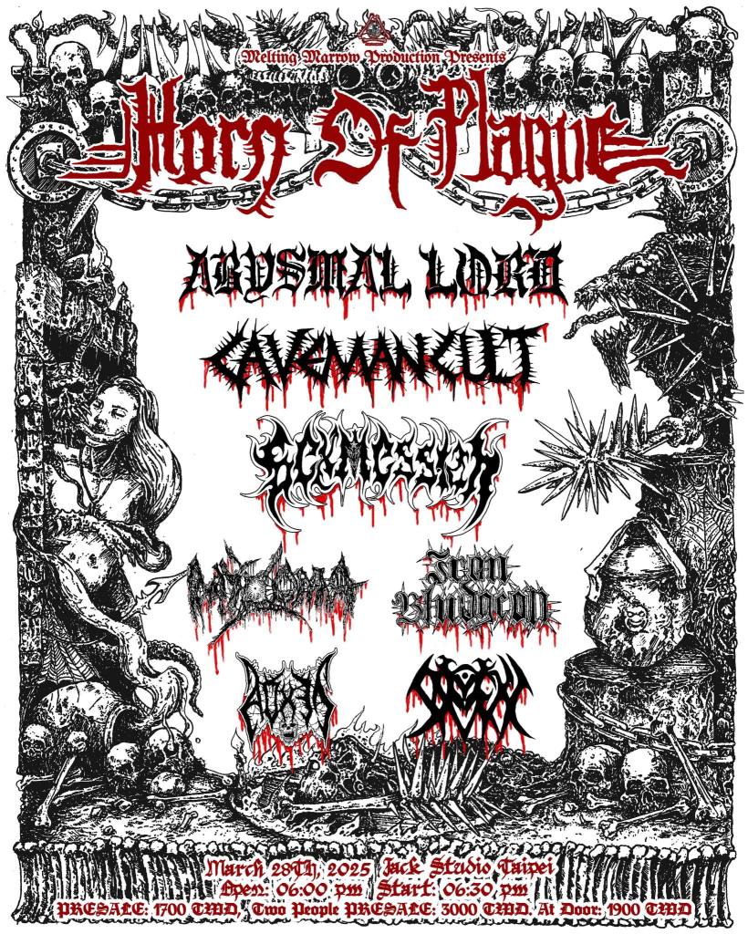 The most current and upcoming concert is poised to destroy and annihilate the Asian and Taiwan scenes with Horn Of Plague, happening on March 28; It’s headlined by Abysmal Lord, Caveman Cult, and Sex Messiah, together with Myxoma, Iron Bludgeon, Aohen, and Orochi.
