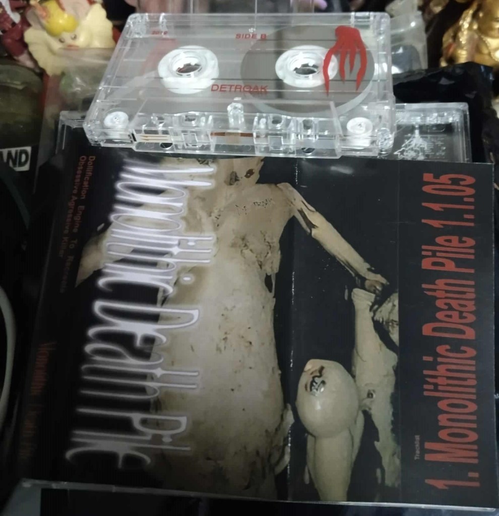 Monolithic Death Pile’s jagged, higher-frequency harsh noise assaults and layers punish and torture the listener anew. The contrast in methodology sets it apart, but is even more grating and piercing. It’s one of the longest “singles” ever, clocking in at 1:01:06. In its digital form, it’s one whole barrage of harsh noise static onslaught with scathing industrial rhythms beneath. On cassette, it plays in two movements from side A to B, complementing the 2 part punishment of the disc.